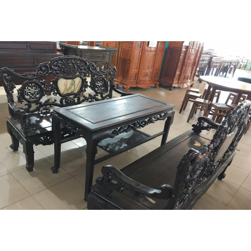 Bộ bàn ghế này được chạm trổ thủ công bởi những nghệ nhân giỏi nên đường nét sắc sảo, tinh tế vô cùng. Với màu đen tự nhiên của gỗ Gụ kết hợp với những hoa văn uốn lượn như “rồng bay phượng múa” nó mang đến một vẻ đẹp đậm chất cổ điển. Rất gần gũi nhưng cũng rất sang trọng. Bộ sản phẩm bao gồm 3 món: 2 ghế dài và 1 bàn dài. Rất thích hợp để đặt ở phòng khách và nhất là những gia đình có nhà thiết kế theo kiểu kiến trúc xưa.