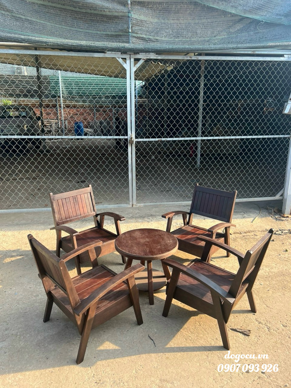 Bộ bàn ghế này cũng rất phù hợp với các khu vực ngồi ngoài trời trong quán cà phê. Được làm từ gỗ Dầu xưa, sản phẩm tạo ra một không gian thoáng mát và dễ chịu cho khách hàng, đặc biệt trong những ngày nắng đẹp.