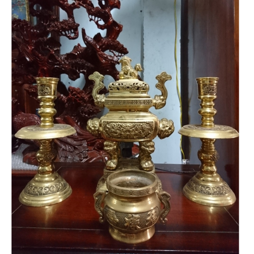 1 đỉnh đồng giữa, 2 chân đèn, 1 lư cắm hương |
