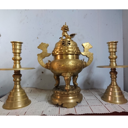 - Đỉnh lư giữa cao: 62 cm - Cặp chân đèn cao: 45cm - Đường kính 2 quai (của đỉnh lư giữa) 38cm |