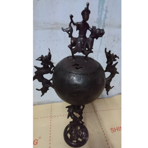 Thân trụ của lư được tạo kiểu độc đáo, dáng uốn lượn hình con rồng. Phần chính là phần đốt trầm có hình cầu, xung quanh có các hoa văn tinh xảo đẹp mắt và có cả chữ Hán. Trên đỉnh là tướng lĩnh cưới ngựa oai phong, 2 bên là 2 con rồng tạo nên một vẻ đẹp vừa kì bí, vừa linh thiêng mà lại vừa rất trang nghiêm.